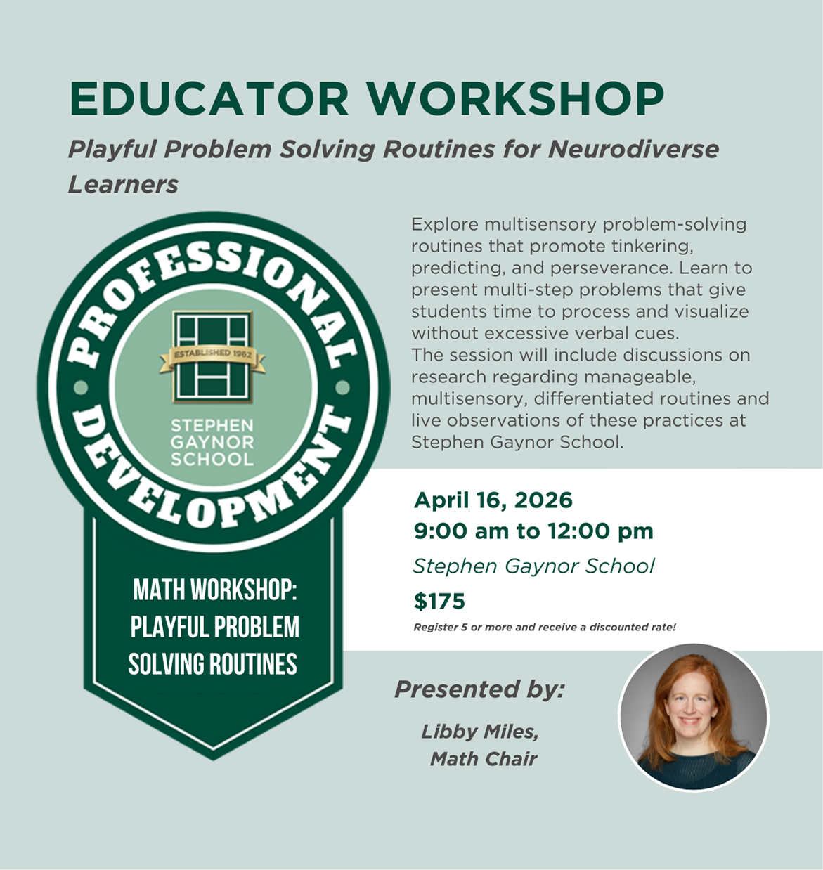 In this session, we will explore multisensory problem-solving routines that promote tinkering, predicting, and persevering while also supporting students who just want to know how to get to the answer. We will practice introducing multi-step problems in a way that allows students time to process and visualize without any additional verbal cueing. Then we will discuss the research behind manageable, multisensory, differentiated routines and visit Stephen Gaynor School classrooms to see some of these routines in action.